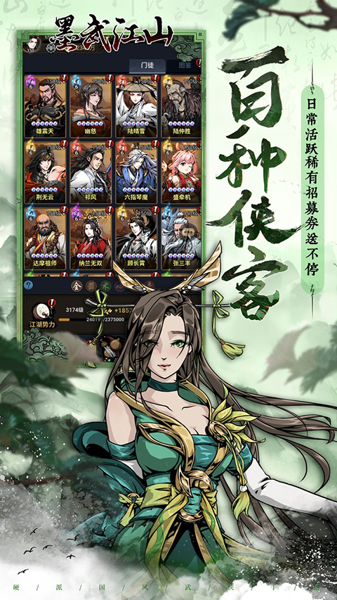 《墨武江山》是一款融合了策略、养成与角色扮演元素的国风战争策略手游。玩家将踏入一个由水墨画风勾勒的江山画卷,扮演一位乱世中的英雄,集结各路名将,运筹帷幄,书写属于自己的传奇篇章。